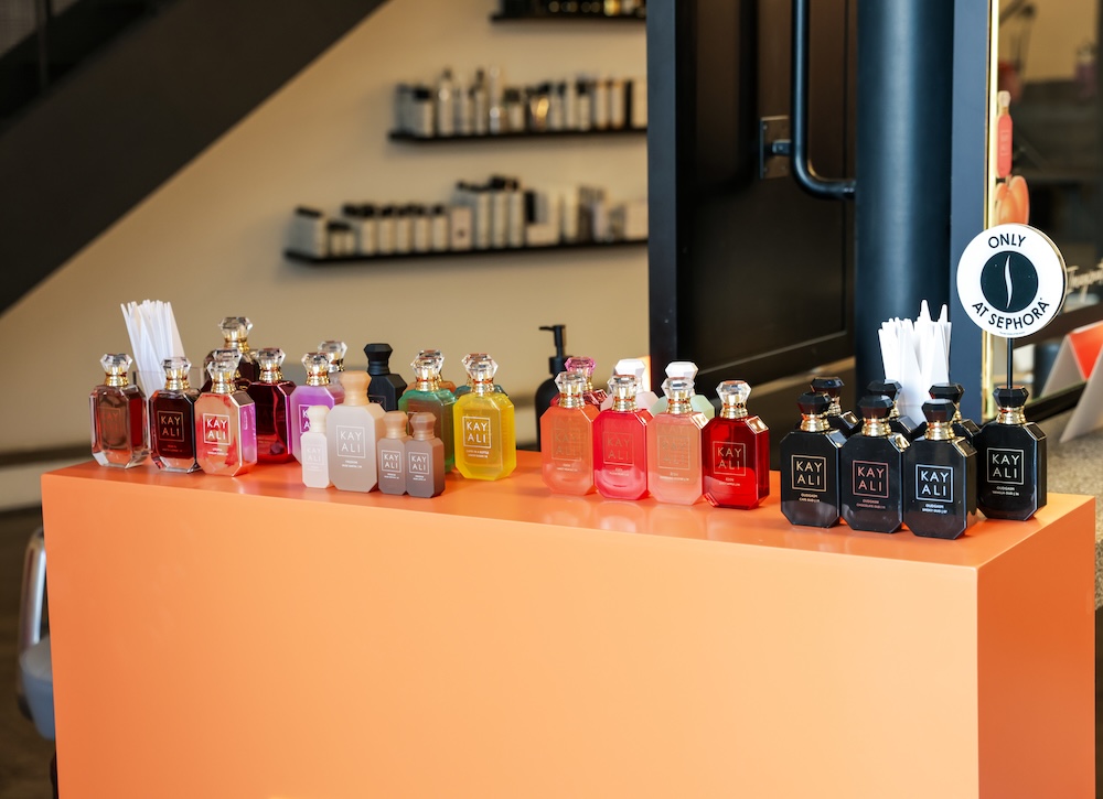 At the centre of it is the layering bar, where guests are invited to explore, mix, and build their own scent identity using KAYALI’s latest launches, Eden Sweet Peach | 35 and Eden Plush Pear | 23.
