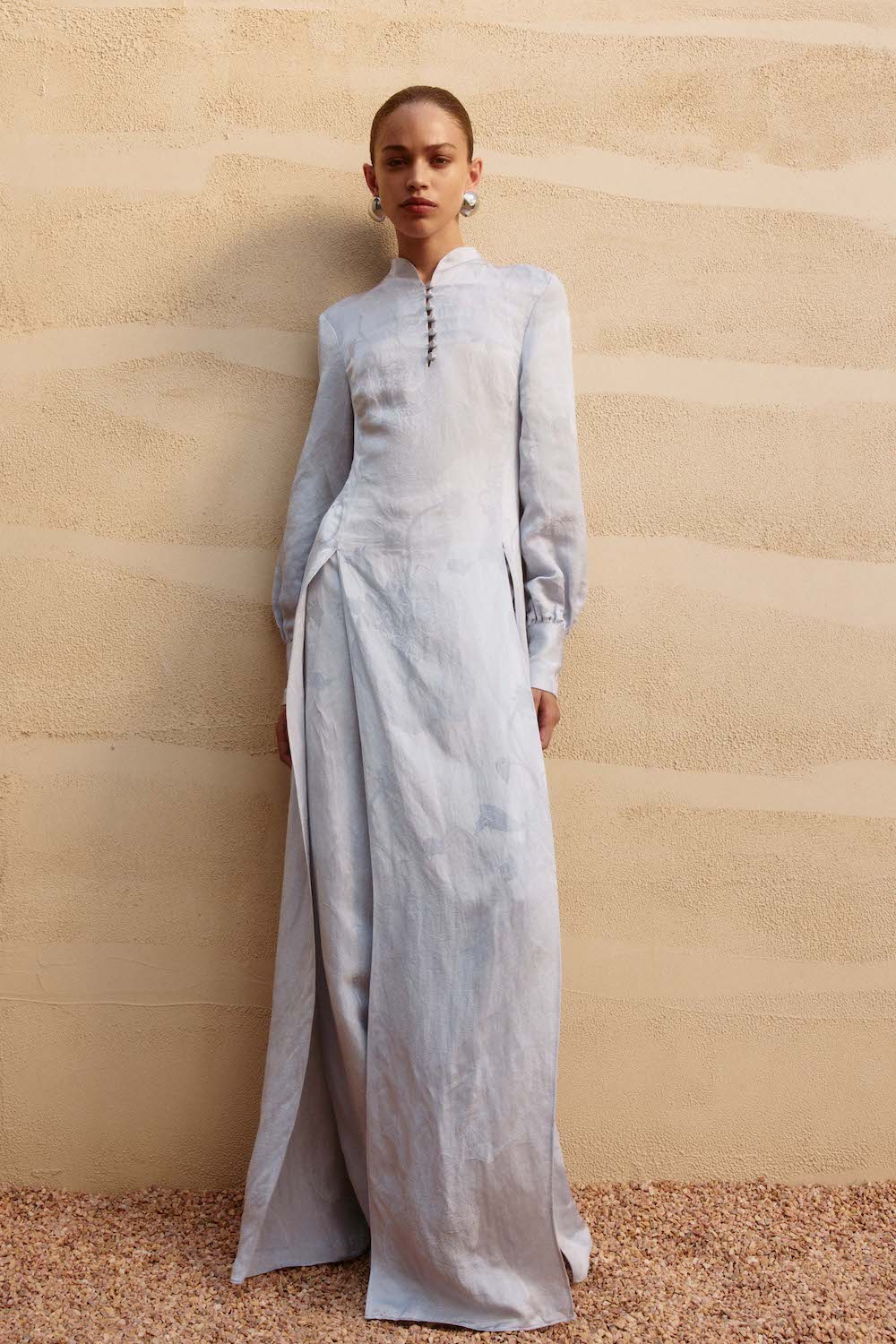 The palette remains intentionally serene — white, pearl, coffee, pale blue and warm gold — hues inspired by desert light, softness, and architectural calm, while stylists from the brand suggest anchoring looks with sculptural jewellery, from bold floral accents to minimalist metallic studs for a contemporary finish.
