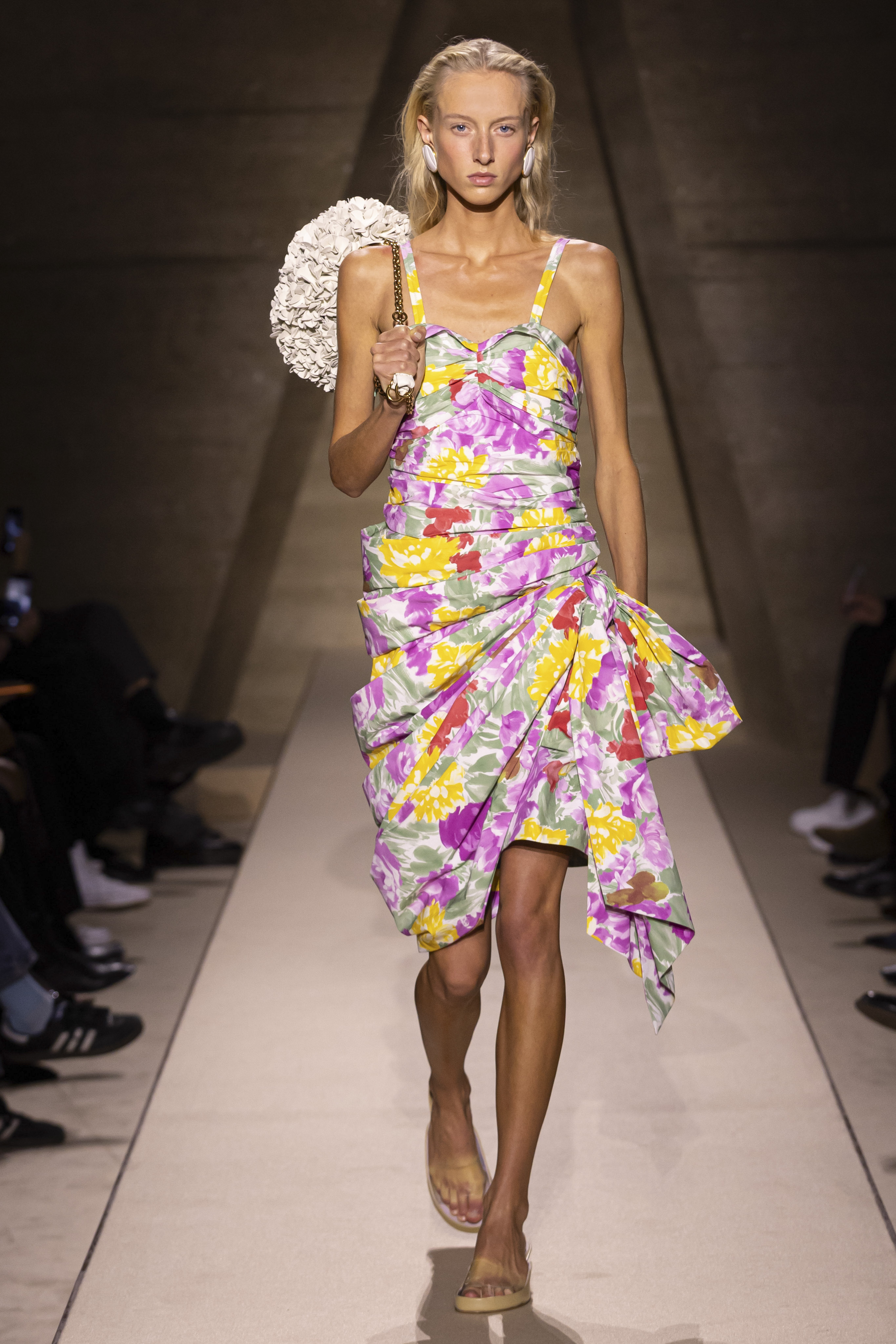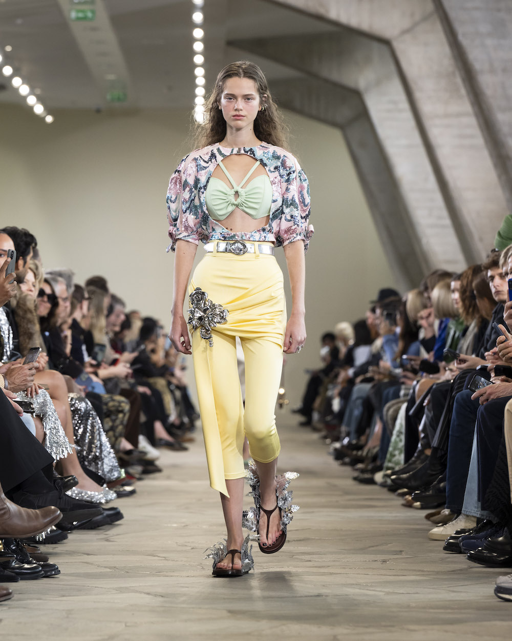 Swimwear served as the departing point, reinvented and reworked with couture-like techniques. Bold cutouts, rich embellishments and nods to nature shaped the collection. Everything was intentional. Metallic details on bustiers and hems were reminiscent of marine wildlife, while shoes featured palm-shaped metalwork accents. The silhouettes evolved as the runway progressed, sensual resortwear transformed into provocative and vanguardist dresses, oversized accessories and lush botanical prints. The capstone was the balance between color, form and material. Despite bordering on excess, each look was tasteful, meticulously crafted and packed a punch.